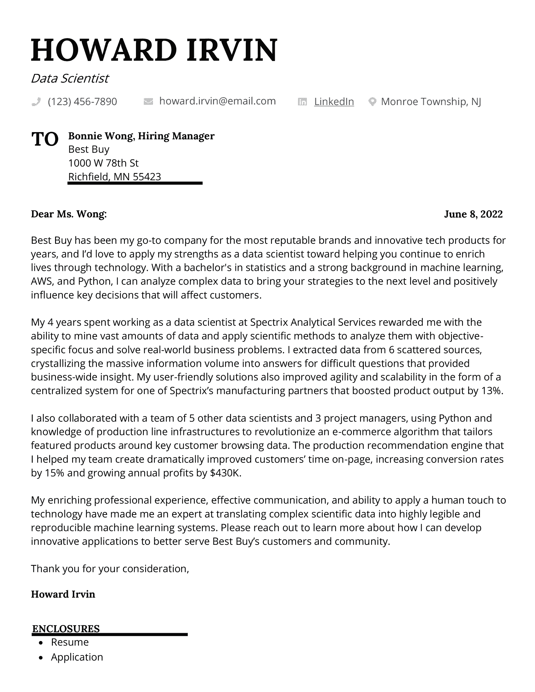 This professional sector deals with the. The closing lines of a data scientist cover letter are the last thing you have to do before proofreading the piece and sending it off. To Whom Is Concern I am writing in regards to the open position for data scientist.
